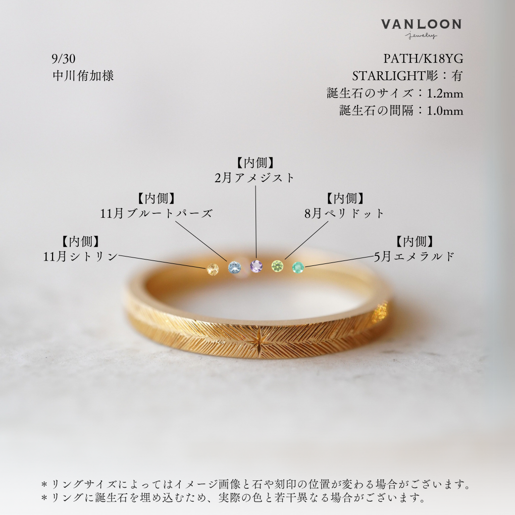 ------------------ リング:PATH(STARLIGHT彫有) 素材:K18YG 天然石:5粒 154,000円(税込) ※天然石応相談 合計 154,000円(税込) ------------------ [K18] 15-19号 +13,200円(税込)、20-21号 + 26,400円(税込)の追加代金を頂きます。