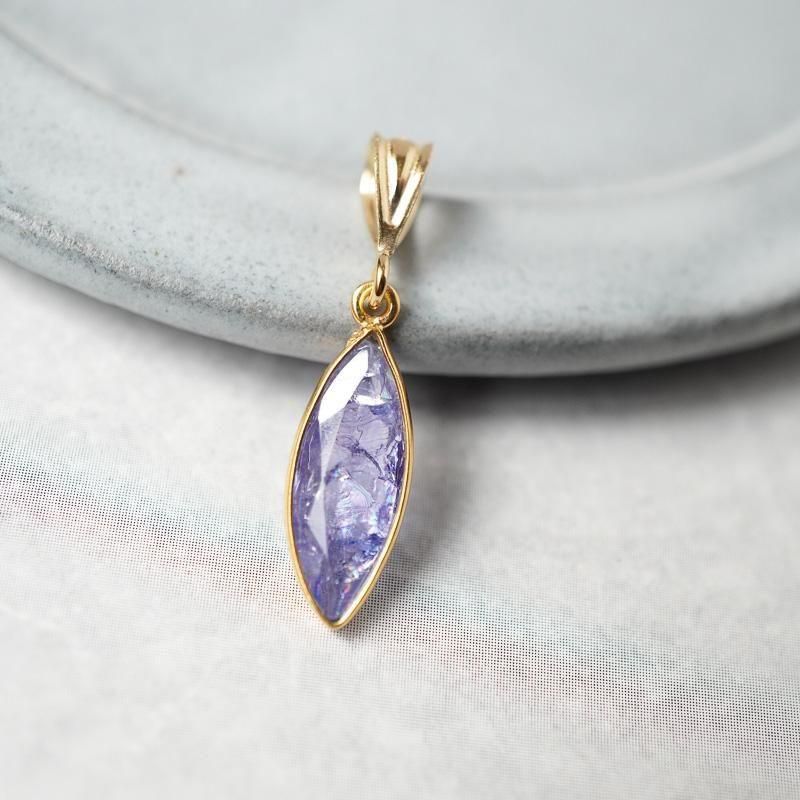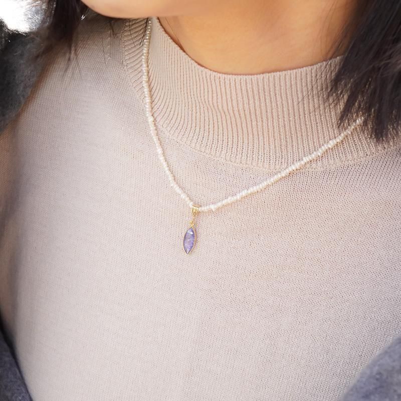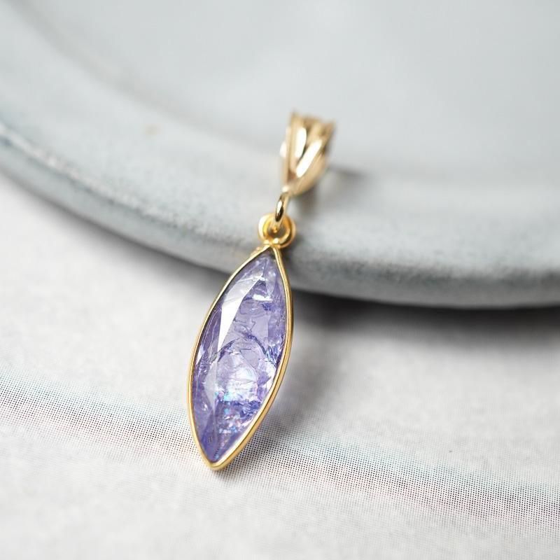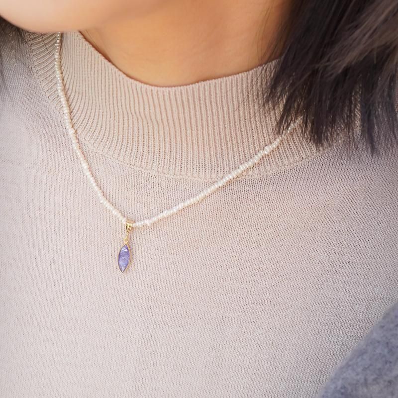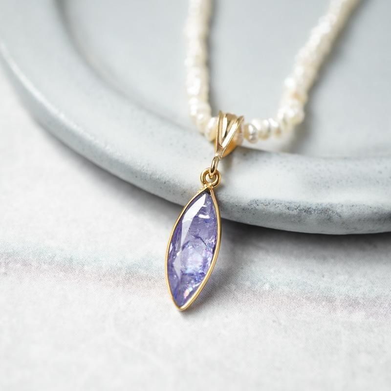 縦長シェイプのタンザナイト。その周りをゴールドが縁取り、胸元で揺れる度に眩く煌めきます。