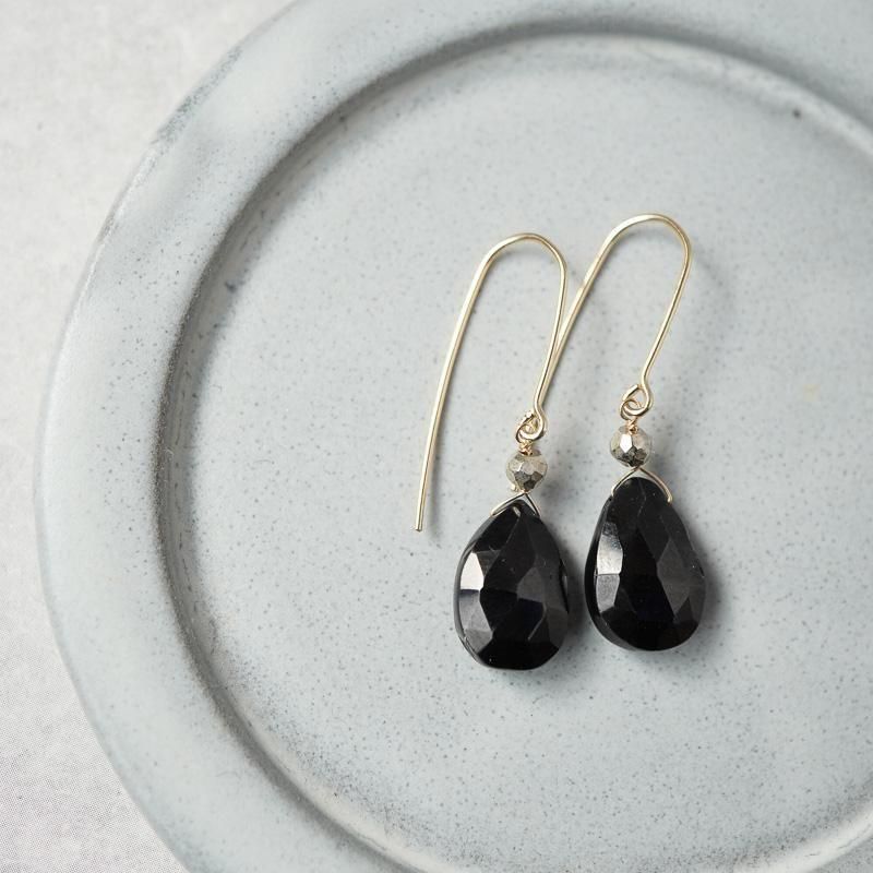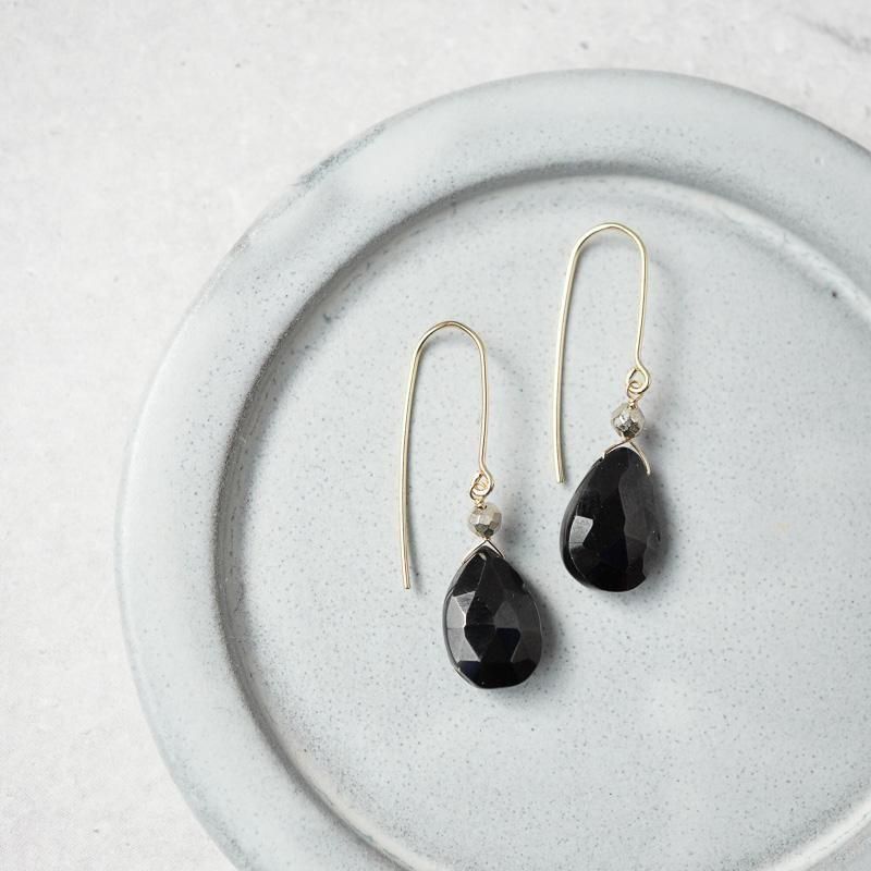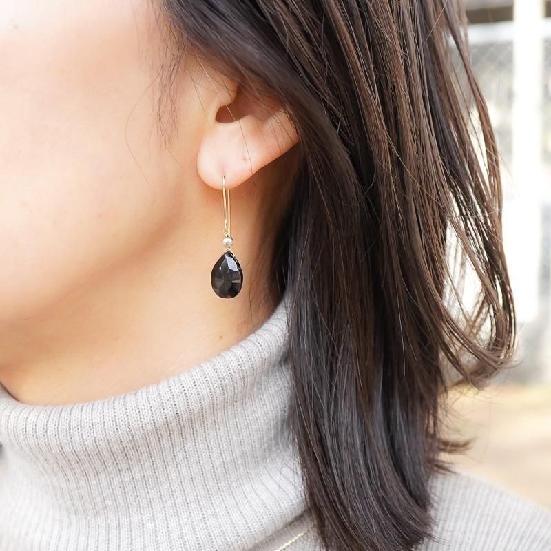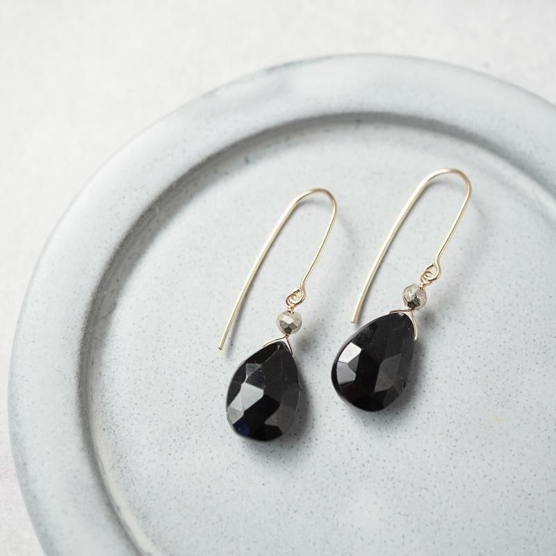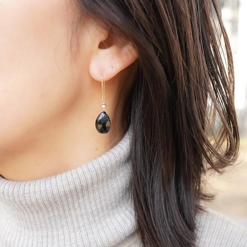 ブラックスピネルを主役に、シルバーカラーのパイライトを添えたロングシルエットのピアス。