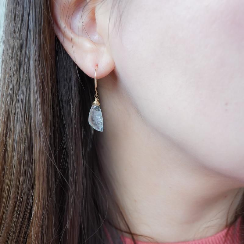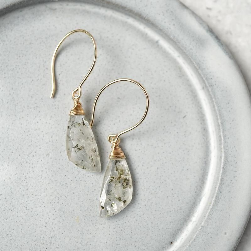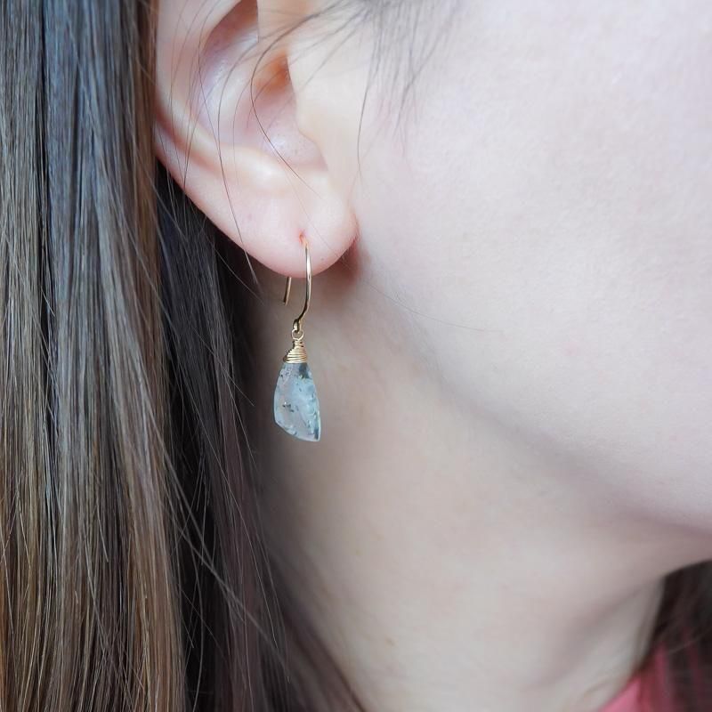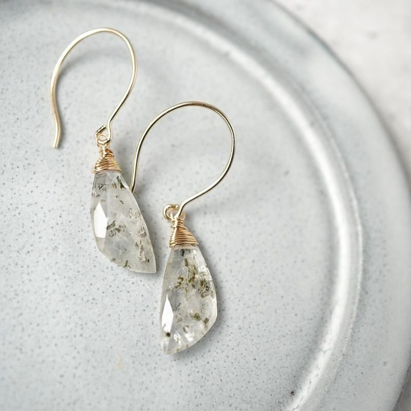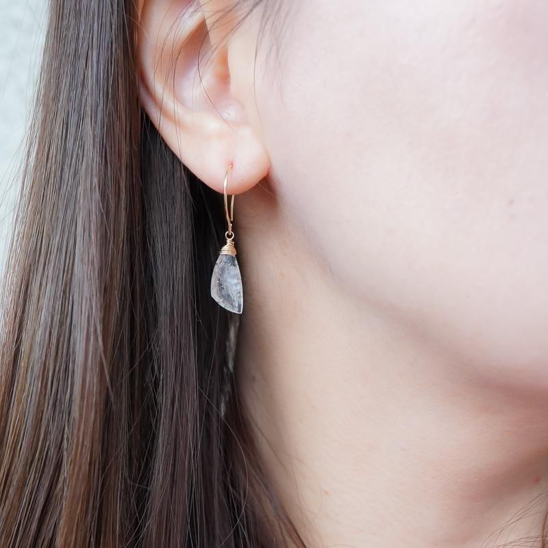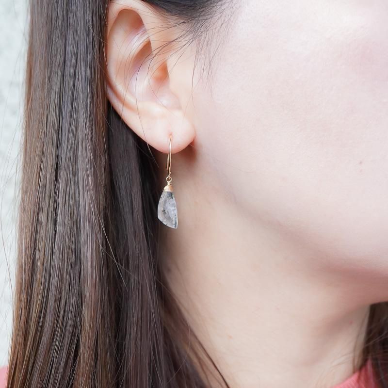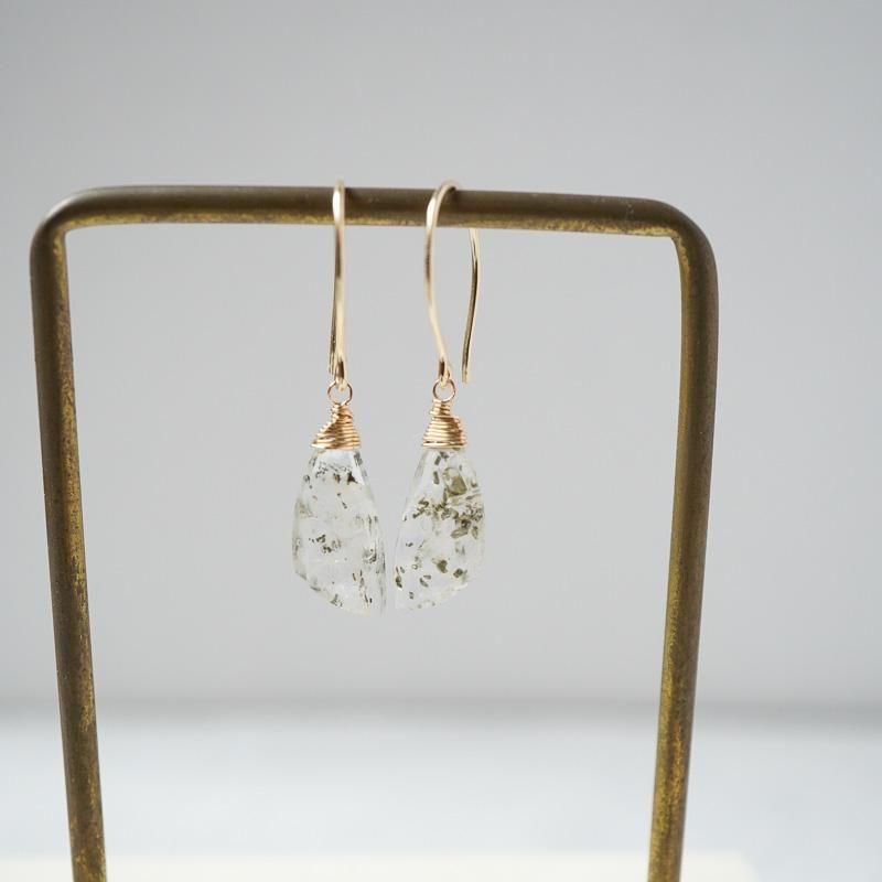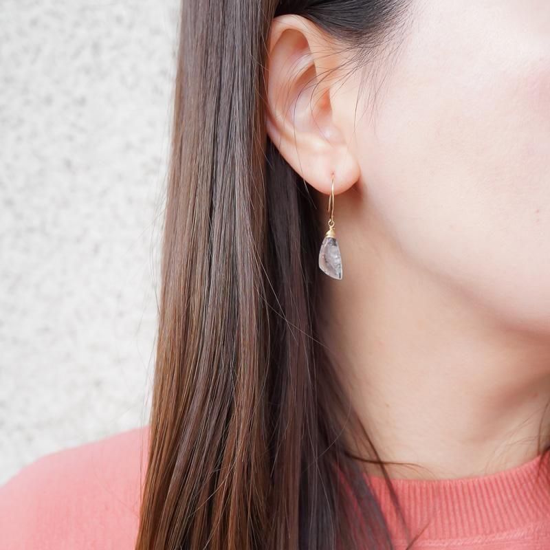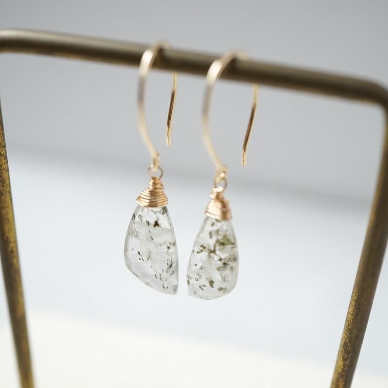 羽のようなシェイプの石が揺れるたびに、無数に入った内包物が柔らかく輝き、さり気なく視線を集めます。