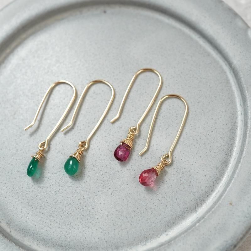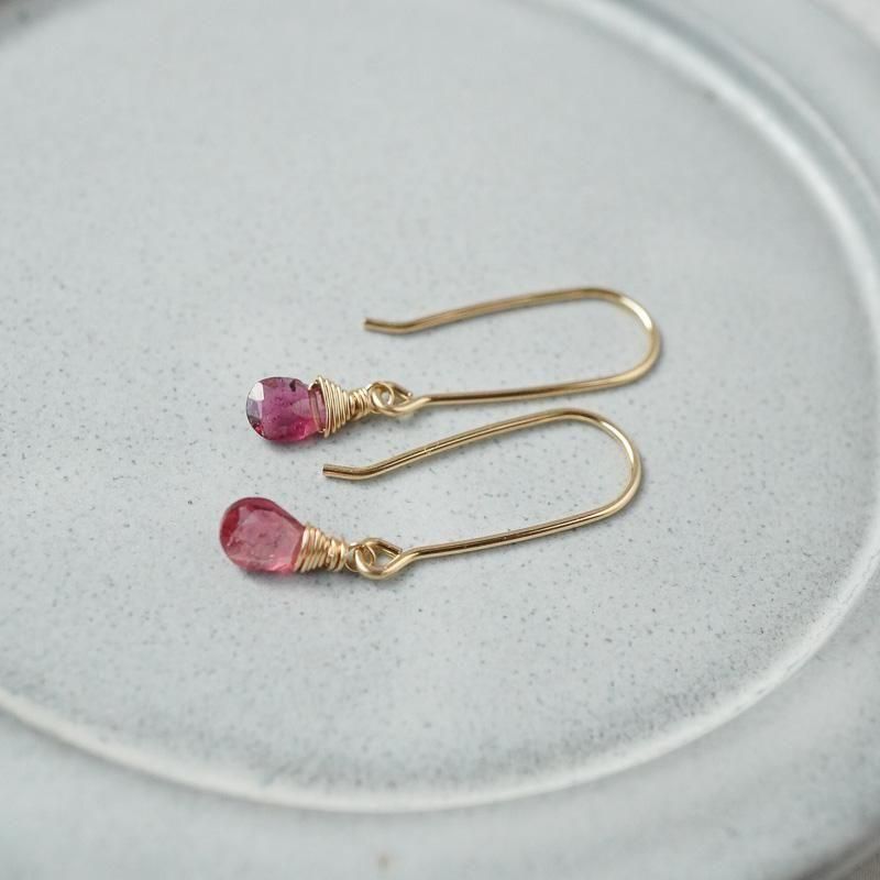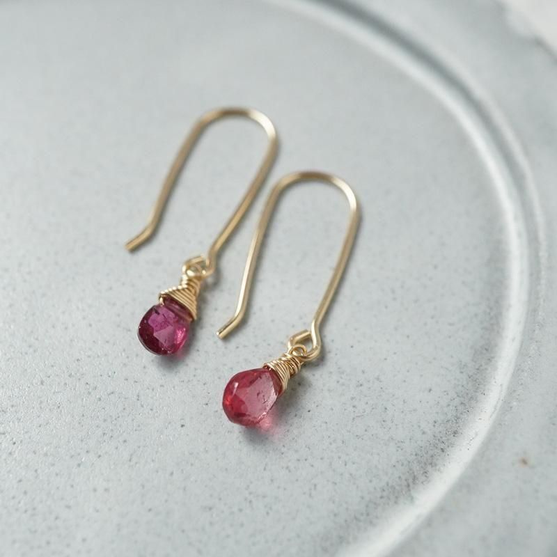 流れる線が美しい、縦にスッと伸びるピアスフックの下に小さなルベライトが一粒きらりと光ります。