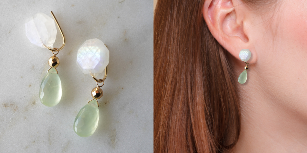 やわらかな光を宿すムーンストーンに、淡いグリーンのプレナイトを合わせた春らしいピアス(イヤリング)です。