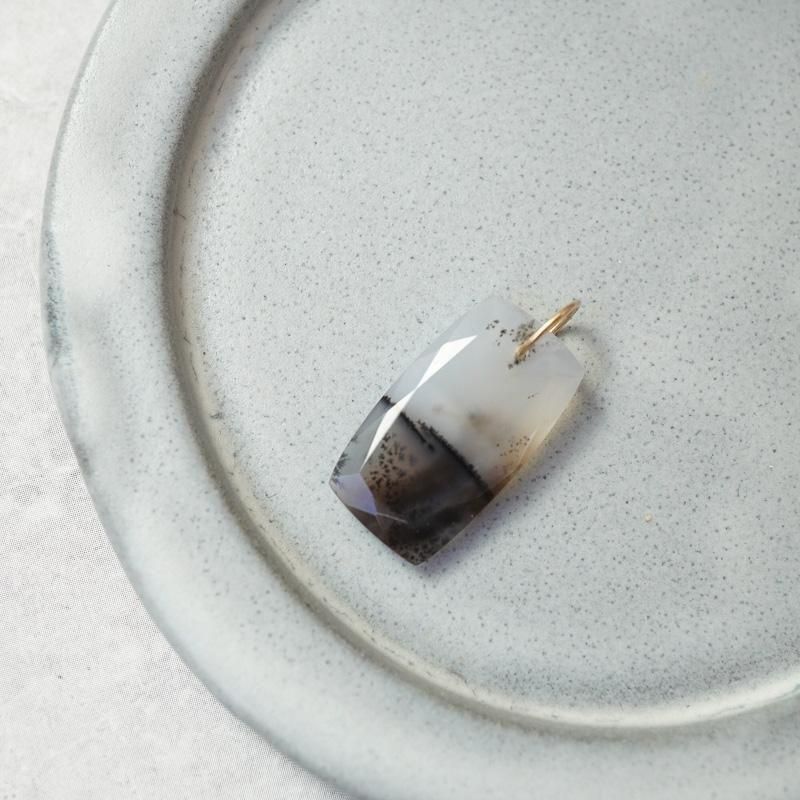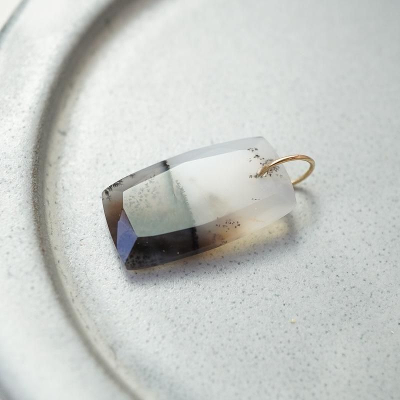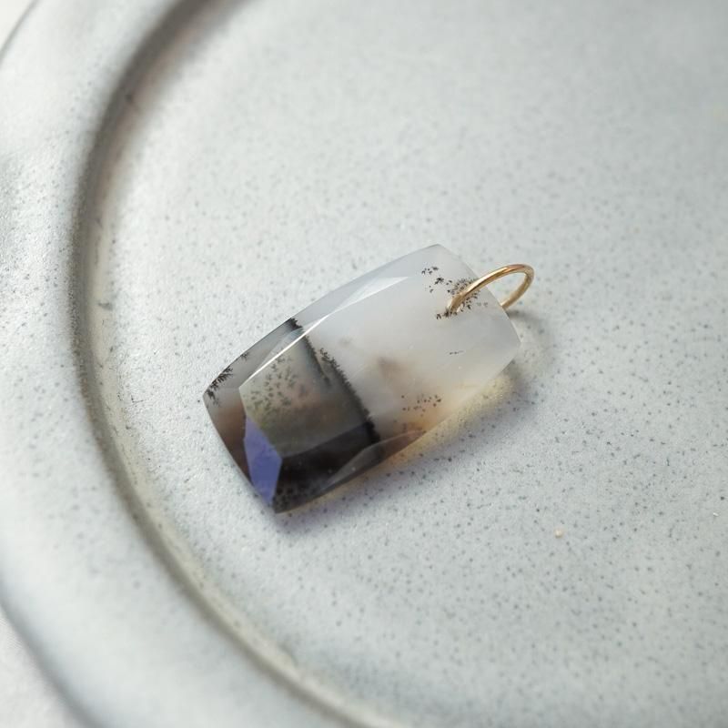 デンドリティッククォーツは、水晶の中に鉱物が樹枝状に結晶化した石です。この石は特に、上半分の透明感と下半分の深い黒のコントラストが際立っています。まるで地平線のような境界線。空と大地を一粒の石に閉じ込めたような表情です。