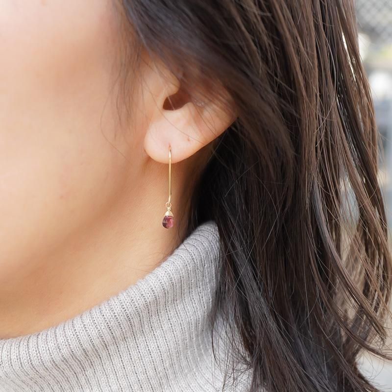 流れる線が美しい、縦にスッと伸びるピアスフックの下に小さなルベライトが一粒きらりと光ります。