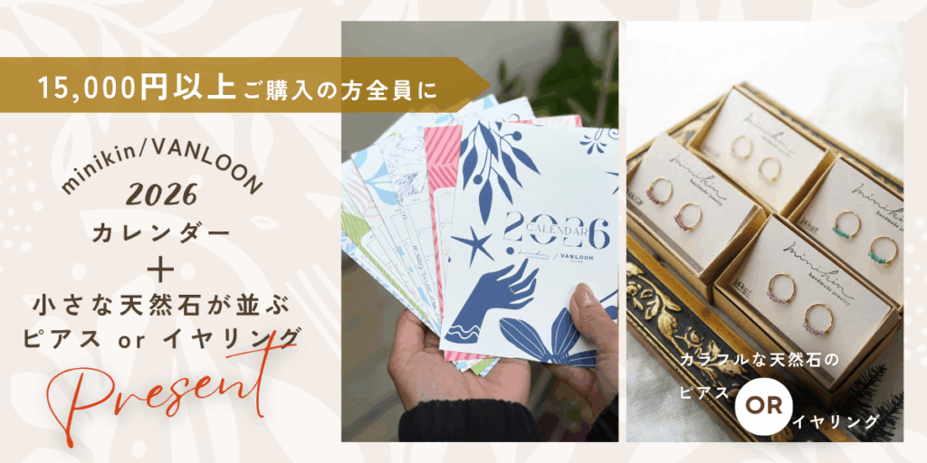 10月31日ご注文分より対象:税込15,000円以上のご注文で、カレンダーに加えてminikinオリジナル天然石が並ぶピアスorイヤリングもプレゼントいたします。