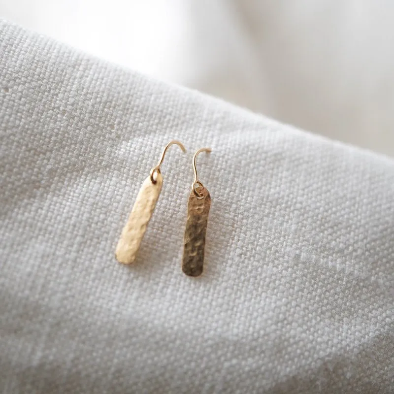 ゴールドの線をローラーで薄く伸ばし、ハンマーで叩いて形成したシンプルなピアス。