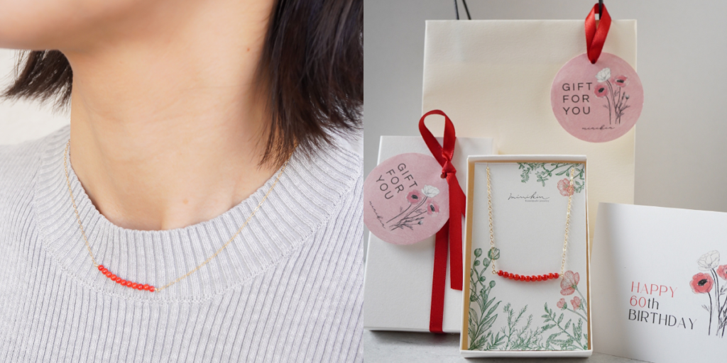 こちらでは還暦祝いの贈り物としてminikinで人気の、レッドコーラル(赤珊瑚)とガーネットのアイテムをご紹介します。